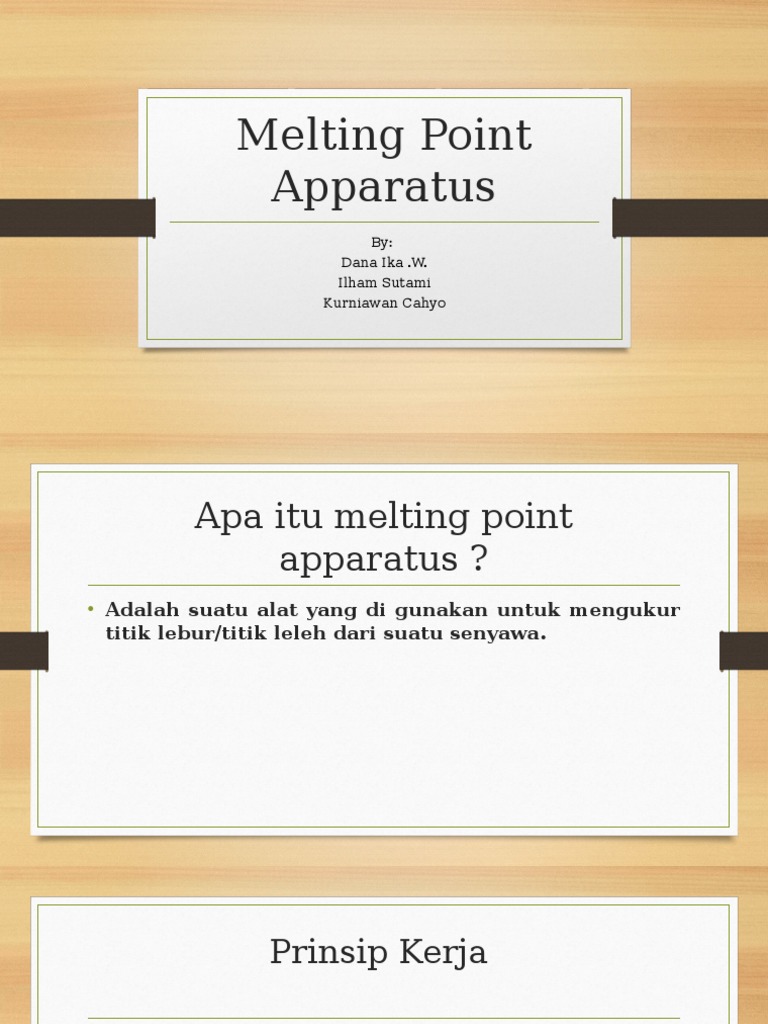 Melting Point Apparatus adalah suatu alat yang di gunakan untuk mengukur titik leburtitik leleh dari suatu senyawa biasanya dalam dunia kimia suatu senyawa itu pasti memiliki titik lebur maupun titik leleh yang sudah di tetapkan oleh ilmuwan yang telah menelitinya ataupun oleh para ahli pakar kimiawan.