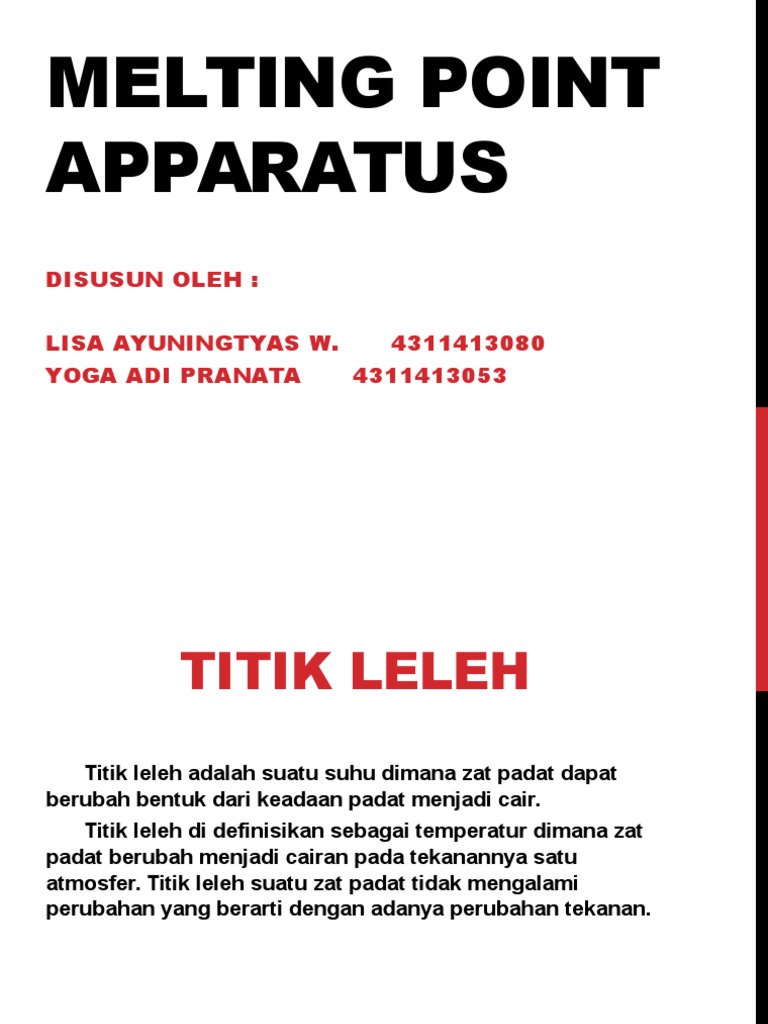 Melting Point Apparatus adalah alat yang digunakan untuk penentuan titik lebur dan titik didih suatu zat. Melting Point Apparatus Melting Point Apparatus adalah suatu alat yang di gunakan untuk mengukur titik leburtitik leleh dari suatu senyawa biasanya dalam dunia kimia suatu senyawa itu pasti memiliki titik lebur maupun titik leleh yang sudah di tetapkan oleh ilmuwan yang telah menelitinya ataupun oleh para ahli pakar kimiawan. Ad Increase performance and accuracy with our automatic melting point instrument.